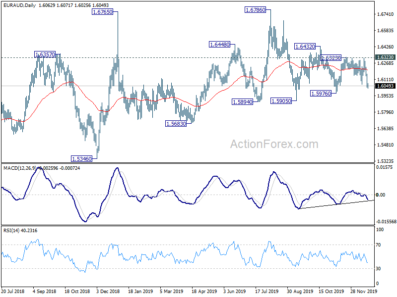 EUR/AUD is staying in consolidation from 1.6294 and intraday bias remains neutral first. For now, further rise will remain mildly in favor as long as 1.5962 support holds. On the upside, break of 1.6314 will re-affirm medium term bullishness and target 1.6432 next.