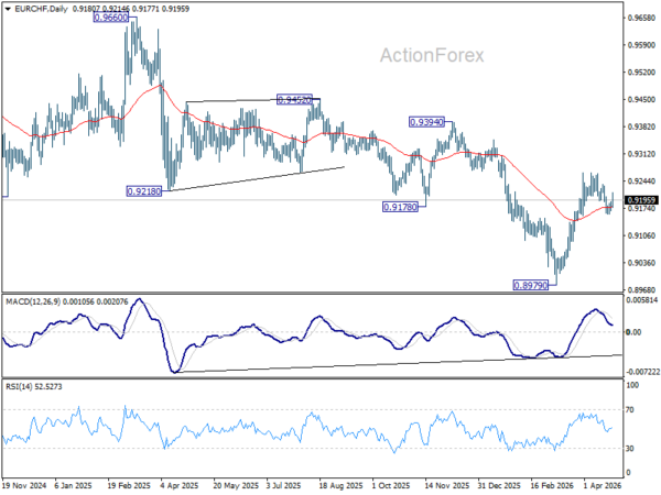 Intraday bias in EUR/CHF stays neutral at this point and further rise is expected with 0.9155 support intact. On the upside, firm break of 0.9264 will resume the rise from 0.8979 to 0.9394 resistance next. However, break of 0.9155 will turn bias back to the downside for deeper pullback instead.