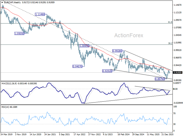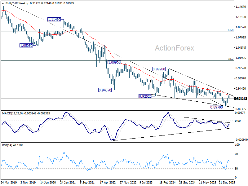 EUR/CHF edged lower to 0.9159 last week but recovered just ahead of 0.9155 support. Outlook is unchanged and initial bias remains neutral this week for more consolidations below 0.9264. Further rally is expected with 0.9155 support intact. On the upside, firm break of 0.9264 will resume the rise from 0.8979 to 0.9394 resistance next. However, break of 0.9155 will turn bias back to the downside for deeper pullback.