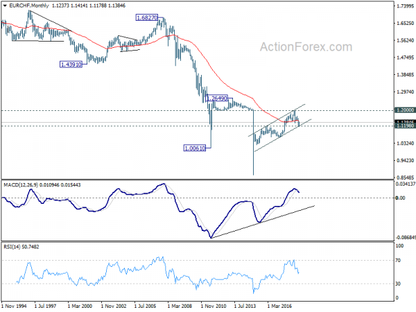 EUR/CHF stayed in consolidation below 1.1492 last week but retreated was contained above 1.1368 minor support. Initial bias stays neutral with mildly bullish outlook. On the upside, above 1.1492 will extend the rebound from 1.1173 to 1.1713 resistance. Decisive break there will confirm completion of whole fall from 1.2004 and target a test on this high. On the downside, however, break of 1.1368 minor support will argue that the rebound has completed and turn bias back to the downside for 1.1154/98 zone again.
