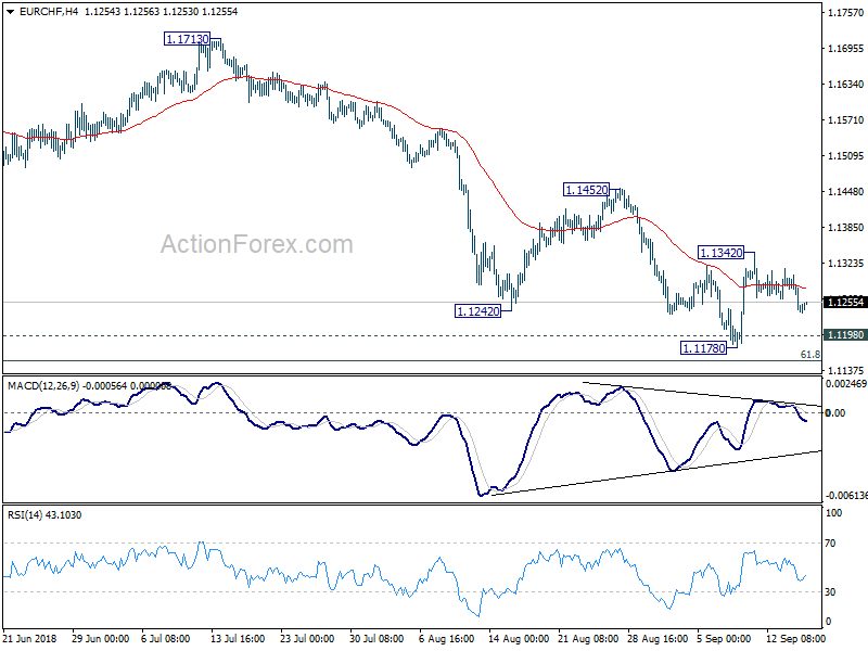 EUR/CHF’s rebound lost momentum after hitting 1.1384 and retreated sharply from there. Intraday bias is turned neutral first. For now, another rise remains mildly in favor as long as 1.1221 support holds, break of 1.1384 will resume the rebound from 1.1178 and target 1.1452 resistance. Decisive break there should confirm near term reversal. That is, whole correction from 1.2004 has completed at 1.1178 after hitting 1.1154/98 key support zone. However, break of 1.1221 will turn focus back to 1.1154/98 key support zone.
