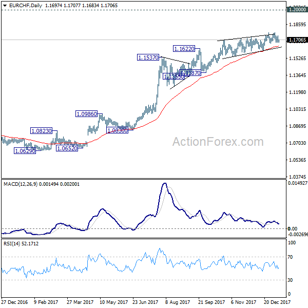 Intraday bias in EUR/CHF stays neutral first. As 1.1683 support holds, near term outlook stays bullish for further rally. Again, considering relatively weak upside momentum, in case of another rise, we’d expect strong resistance below 1.2 handle to bring medium term reversal. Break of 1.1683 support will be a early sign of reversal and turn focus to 1.1602 support.