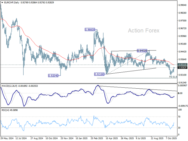 In the bigger picture, outlook remains bearish with EUR/CHF staying well inside long term falling channel after multiple rejection by 55 W EMA (now at 0.9383). Firm break of 0.9204 will resume the whole down trend from 1.2004 (2018 high). Next target is 61.8% projection of 1.1149 to 0.9407 from 0.9928 at 0.8851. However, break of 0.9452 resistance will now be the first sign of medium term bottoming.