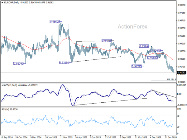 Intraday bias stays neutral in EUR/CHF for consolidations above 0.9092. Further decline is expected as long as 0.9180 resistance holds. Below 0.9092 will resume larger down trend to 261.8% projection of 0.9394 to 0.9268 from 0.9347 at 0.9017 next. However, considering bullish convergence condition in 4H MACD, firm break of 0.9180 will indicate short term bottoming, and bring stronger rebound towards 55 D EMA (now at 0.9242).