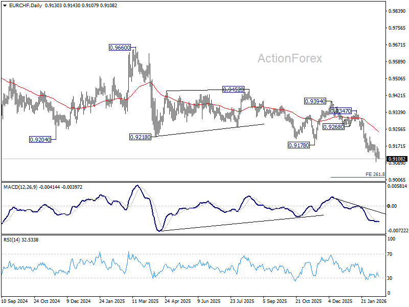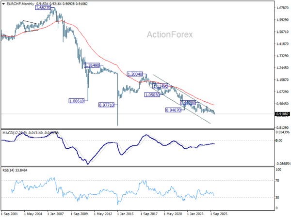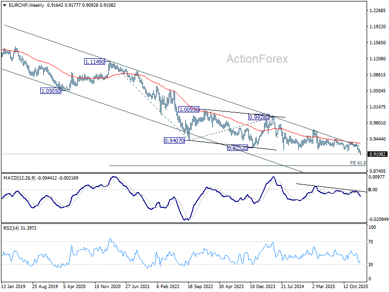 In the bigger picture, down trend from 0.9928 (2024 high) is still in progress with falling 55 W EMA (now at 0.9334) intact. Next target is 61.8% projection of 1.1149 to 0.9407 from 0.9928 at 0.8851. Outlook will stay bearish as long as 0.9394 resistance holds, in case of recovery.