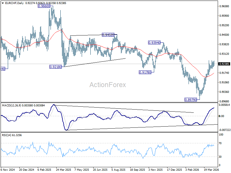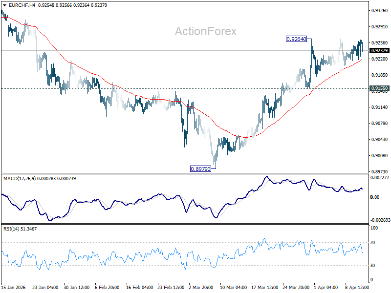Intraday bias in EUR/CHF stays neutral and more consolidations could be seen below 0.9264. On the upside, sustained trading above 61.8% retracement of 0.9394 to 0.8979 at 0.9235 will pave the way to 0.9394 key resistance next. However, break of 0.9155 support will turn bias back to the downside for 0.8979 low.