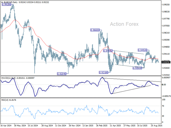 In the bigger picture, the down trend from 0.9204 (2018 high) might still be in progress considering that EUR/CHF is staying well inside the long term falling channel. However, with bullish convergence condition in W MACD, downside potential should be limited in case of another fall. Instead, firm break of 0.9660 resistance will be an important sign of medium term bullish trend reversal.