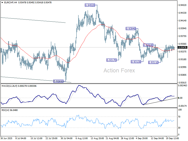 Range trading continues in EUR/CHF and intraday bias stays neutral. Considering bullish convergence condition in 4H MACD, firm break of 0.9354 resistance will confirm short term bottoming, and bring stronger rebound to 0.9394 resistance. On the downside, break of 0.9311 will resume the fall from 0.9452 to 0.9265 support.