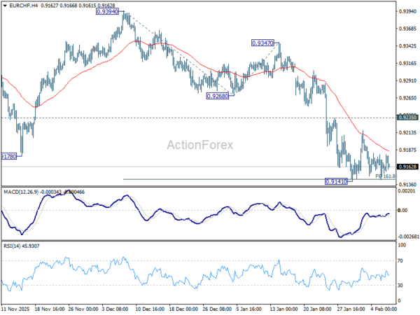 Intraday bias stays neutral in EUR/CHF for consolidations above 0.9092. Further decline is expected as long as 0.9180 resistance holds. Below 0.9092 will resume larger down trend to 261.8% projection of 0.9394 to 0.9268 from 0.9347 at 0.9017 next. However, considering bullish convergence condition in 4H MACD, firm break of 0.9180 will indicate short term bottoming, and bring stronger rebound towards 55 D EMA (now at 0.9242).