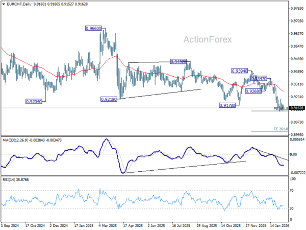 Intraday bias in EUR/CHF remains on the downside at this point. Current down trend should extend to 261.8% projection of 0.9394 to 0.9268 from 0.9347 at 0.9017 next. On the upside, however, break of 0.9180 resistance will now indicate short term bottoming, and bring lengthier consolidations.