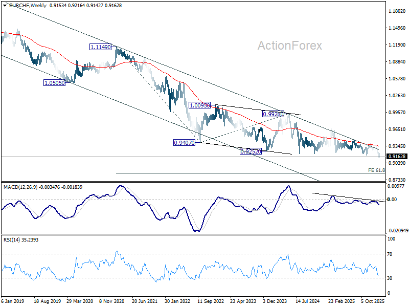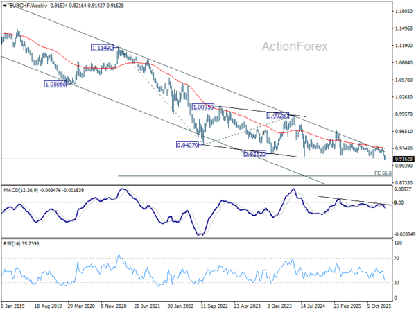 In the bigger picture, down trend from 0.9928 (2024 high) is still in progress with falling 55 W EMA (now at 0.9334) intact. Next target is 61.8% projection of 1.1149 to 0.9407 from 0.9928 at 0.8851. Outlook will stay bearish as long as 0.9394 resistance holds, in case of recovery.