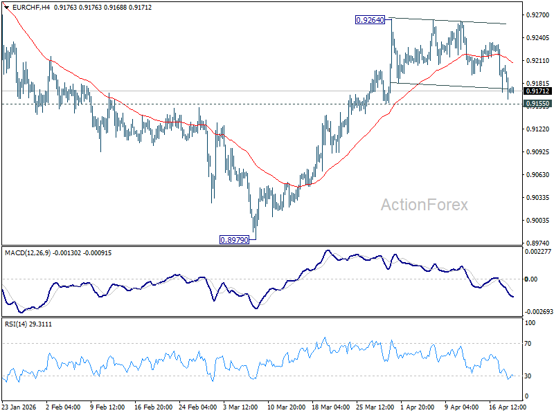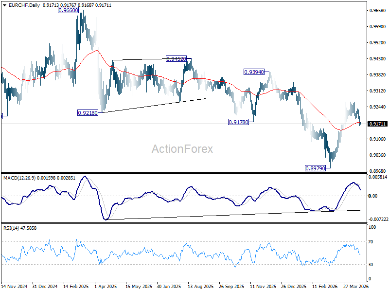 Intraday bias sin EUR/CHF stays neutral and consolidations from 0.9264 could extend further. With 0.9155 support intact, further rally is still expected. Firm break of 0.9264 will resume the rise from 0.8979 to 0.9394 resistance next. However, break of 0.9155 will turn bias back to the downside for deeper pullback.
