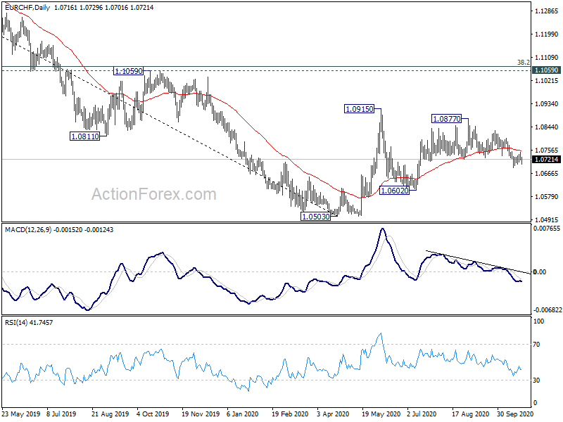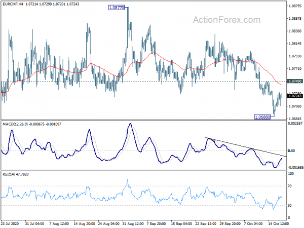 Intraday bias in EUR/CHF remains neutral and further fall is expected with 1.0749 resistance intact. Current decline from 1.0877 is seen as the third leg of the corrective pattern from 1.0915. On the downside, break of 1.0688 will turn bias to the downside for 1.0602 support next. However, on the upside, firm break of 1.0749 will mix up the near term outlook, and turn bias back to the upside for stronger rebound.
