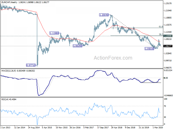 No change in EUR/CHF’s outlook. Further decline is expected as long as 1.0698 resistance holds. Decline from 1.0915 would target a test on 1.0503 low. On the upside, however, firm break of .0698 resistance will indicate short term bottoming. Intraday bias will be turned back to the upside for stronger rebound.