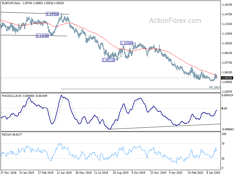 EUR/CHF is staying in range below 1.0662 temporary top and intraday bias remains neutral first. Further rise remains in favor as long as 1.0578 minor support holds. Above 1.0662 will turn bias back to the upside for 1.0710 cluster resistance (38.2% retracement of 1.1059 to 1.0503 at 1.0715). Considering bullish convergence condition in daily MACD, sustained break of 1.0710/5 will carry larger bullish implications and target 61.8% retracement at 1.0847 and above. However, break of 1.0578 minor support will turn focus back to 1.0503 low.