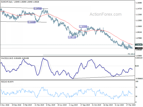 EUR/CHF retreated sharply after rebounding to 1.0611 but drew support from 4 hour 55 EMA. Intraday bias is turned neutral first. Consolidation from 1.0503 might extend further. But upside should be limited by 1.0653 resistance to bring down trend resumption. On the downside, break of 1.0503 will target 100% projection of 1.1476 to 1.0811 from 1.1059 at 1.0394.
