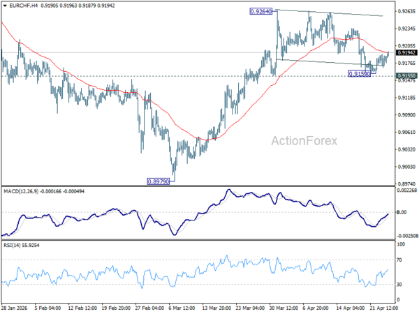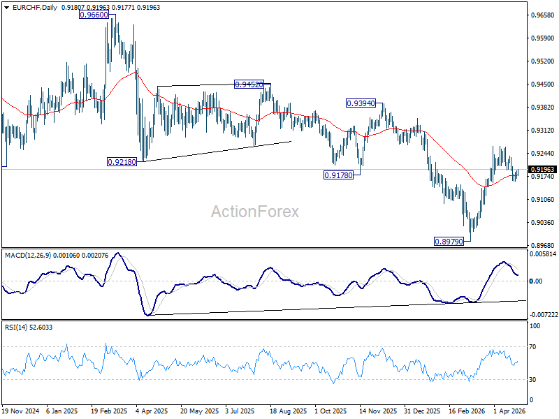 Intraday bias in EUR/CHF stays neutral at this point and further rise is expected with 0.9155 support intact. On the upside, firm break of 0.9264 will resume the rise from 0.8979 to 0.9394 resistance next. However, break of 0.9155 will turn bias back to the downside for deeper pullback instead.