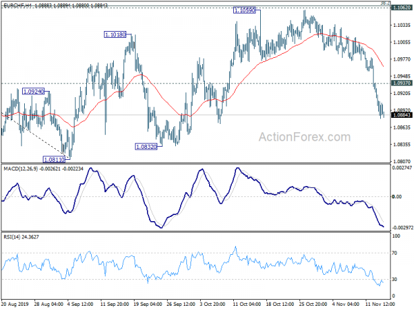 Intraday bias in EUR/CHF remains on the downside at this point. Rise form 1.0863 should have completed at 1.1027. Deeper fall should be seen back to 1.0811/63 support zone. Decisive break there will indicate larger down trend resumption. On the upside, above 1.0973 minor resistance will turn intraday bias neutral first. In case of another rise, upside should be limited by 1.1062 cluster resistance (38.2% retracement of 1.1476 to 1.0811 at 1.1065).