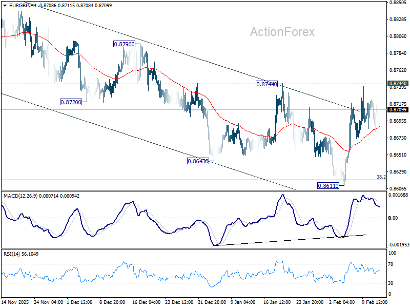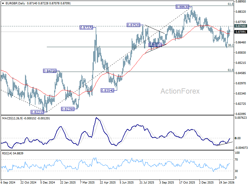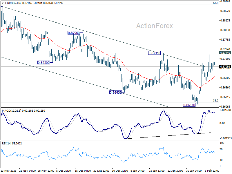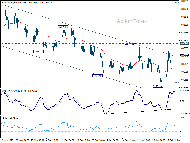 EUR/GBP is still limited below 0.8744 resistance despite extended rebound. Intraday bias remains neutral first On the upside, firm break of 0.8744 resistance will argue that fall from 0.8863 has completed at 0.8611 as a correction. Further rally should be seen back to retest 0.8863 high. On the downside, sustained break of 38.2% retracement of 0.8221 to 0.8663 at 0.8618 will carry larger bearish implications and turn outlook bearish.