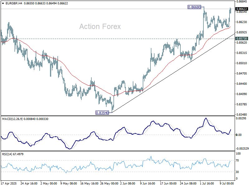 EUR/GBP stayed in consolidation below 0.8668 last week. Initial bias remains neutral this week first, and further rise is expected as long as 0.8573 resistance turned support holds. Above 0.8668 will resume the rally from 0.8354 to retest 0.8737 high.