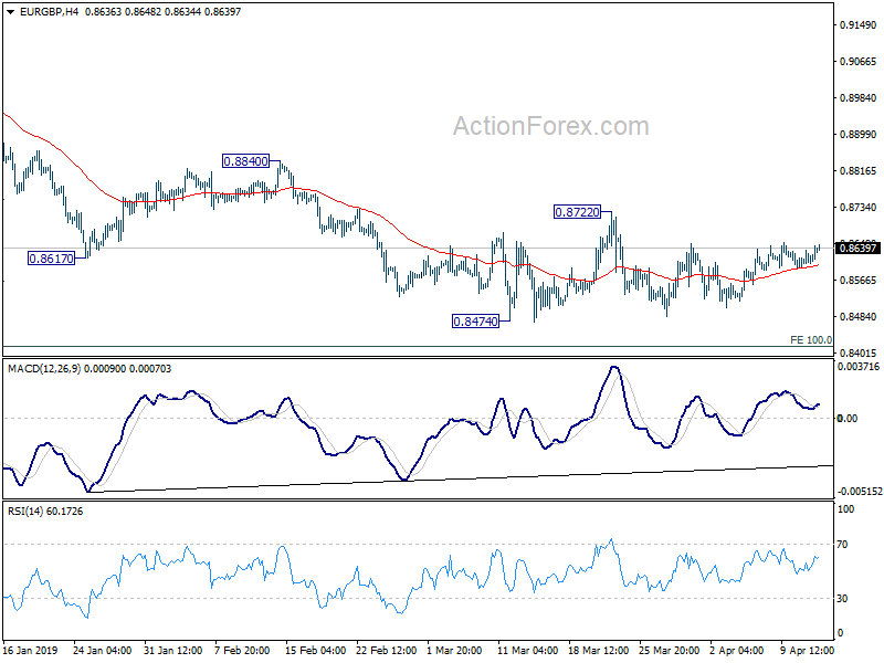 Intraday bias in EUR/GBP remains neutral at consolidation from 0.8474 is extending. Upside should be limited by 0.8722 resistance to bring down trend resumption. On the downside, firm break of 0.8474 will resume larger down trend for 0.8416 long term projection next. On the upside, though, sustained break of 0.8722 will suggest near term reversal and bring stronger rise back to 0.8840 resistance and above.