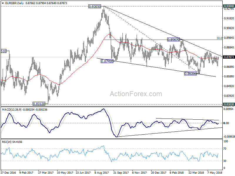 EUR/GBP attempted to break out from recent sideway trading last week, but failed below 0.8844 resistance. Initial bias remains neutral this week first. Nonetheless, another rise is expected as long as 0.8693 support holds. Break of 0.8844 will resume the rebound from 0.8620 for 0.8967 cluster resistance (50% retracement of 0.9305 to 0.8620 at 0.8963). However, break of 0.8693 will bring deeper fall back to retest 0.8620 low.