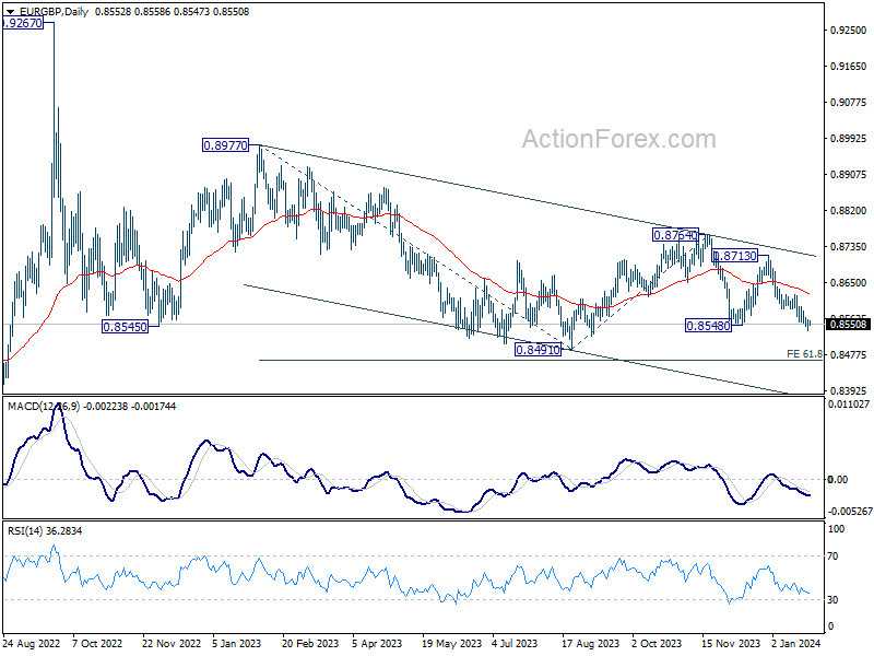 In the bigger picture, as long as 0.8624 resistance holds, down trend from 0.9267 is expected to continue. Firm break of 0.8382 will target 0.8201 (2022 low). However, decisive break of 0.8624 will indicate that such down trend has completed, and turn outlook bullish for 0.8764 resistance next.