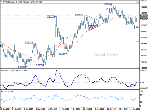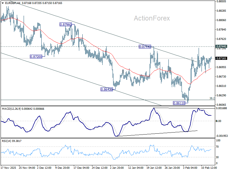 Intraday bias in EUR/GBP stays neutral and outlook is unchanged. On the upside, firm break of 0.8744 resistance will argue that fall from 0.8863 has completed at 0.8611 as a correction. Further rally should be seen back to retest 0.8863 high. On the downside, sustained break of 38.2% retracement of 0.8221 to 0.8663 at 0.8618 will carry larger bearish implications and turn outlook bearish.