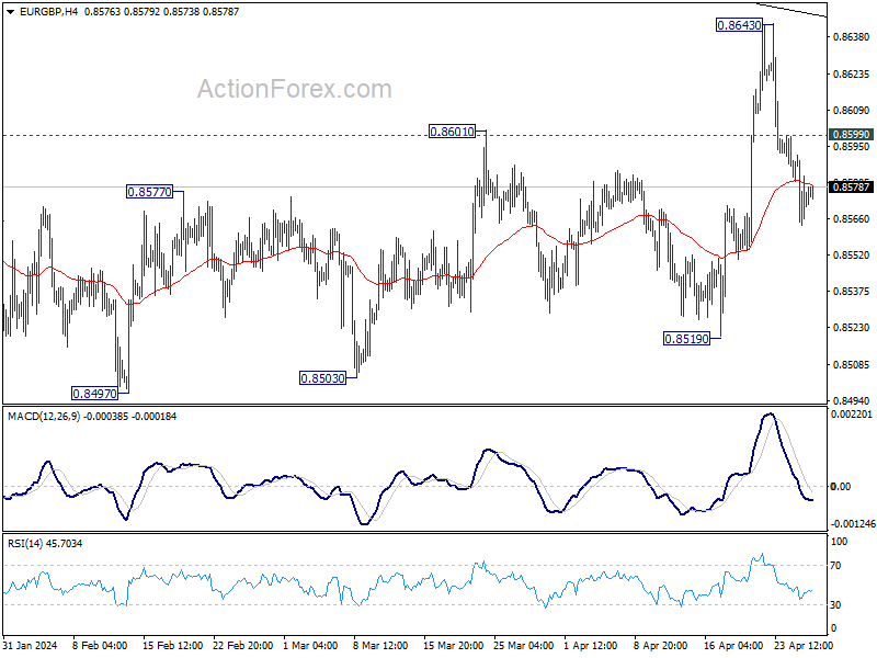 Break of 55 4H EMA suggests that EUR/GBP’s rise from 0.8519 has completed at 0.8643, ahead of medium term trend line resistance. near term bearishness is retained. Intraday bias is back on the downside for retesting 0.8491/7 support zone. On the upside, above 0.8599 minor resistance will turn intraday bias neutral again.