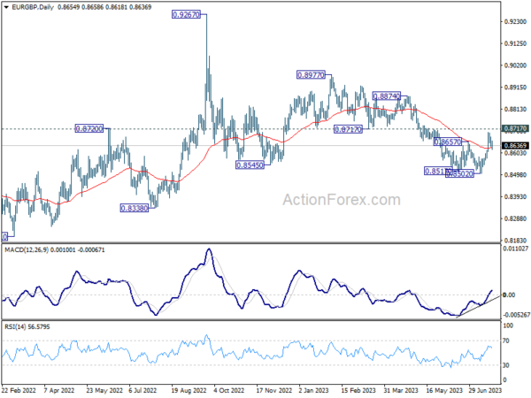 Intraday bias in EUR/GBP stays on the downside at this point. Recovery from 0.8502 could have completed ahead o f0.8717 support turned resistance, keeping outlook bearish. Retest of 0.8502 low should be seen next, and firm break there will resume larger decline form 0.8977. On the upside, above 0.8618 minor resistance will turn intraday bias neutral first.