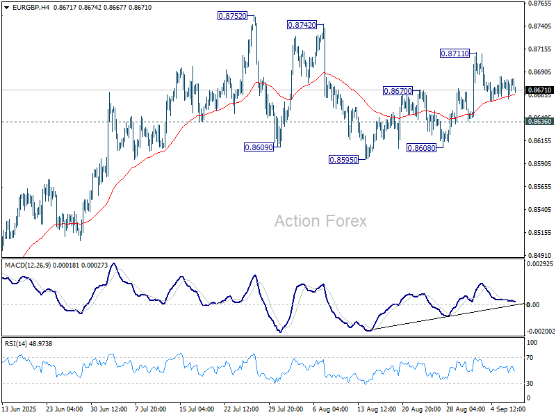 EUR/GBP rose further to 0.8750 last week but retreated ahead of 0.8752 resistance. Initial bias turned neutral this week first. Further rally is expected as long as 0.8694 support holds. Firm break of 0.8752 will resume larger rally to 61.8% projection of 0.8354 to 0.8752 from 0.8631 at 0.8877, which is close to 0.8867 However, break of 0.8694 will turn bias back to the downside for 0.8631 support instead.