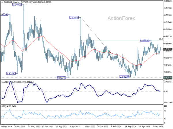 In the bigger picture, strong support was seen again from 38.2% retracement of 0.8821 to 0.8863 at 0.8618. Break of 0.8788 resistance will argue that larger rise from 0.8221 might be ready to resume through 0.8863 (2025 high). Nevertheless, sustained trading below 0.8618 should confirm bearish reversal, and bring deeper fall to 61.8% retracement at 0.8466 at least.