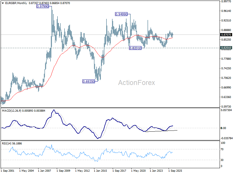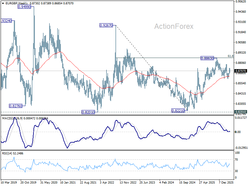 In the bigger picture, strong support was seen again from 38.2% retracement of 0.8821 to 0.8863 at 0.8618. Break of 0.8788 resistance will argue that larger rise from 0.8221 might be ready to resume through 0.8863 (2025 high). Nevertheless, sustained trading below 0.8618 should confirm bearish reversal, and bring deeper fall to 61.8% retracement at 0.8466 at least.
