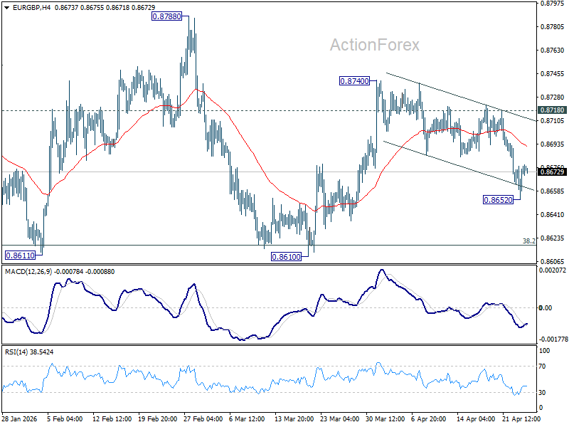 Intraday bias in EUR/GBP is turned neutral first with current recovery. But further fall is expected as long as 0.8718 resistance holds. Below 0.8652 will extend the decline from 0.8740 to retest 0.8610 low. However, break of 0.8718 will resume the rebound from 0.8610 through 0.8740 resistance.