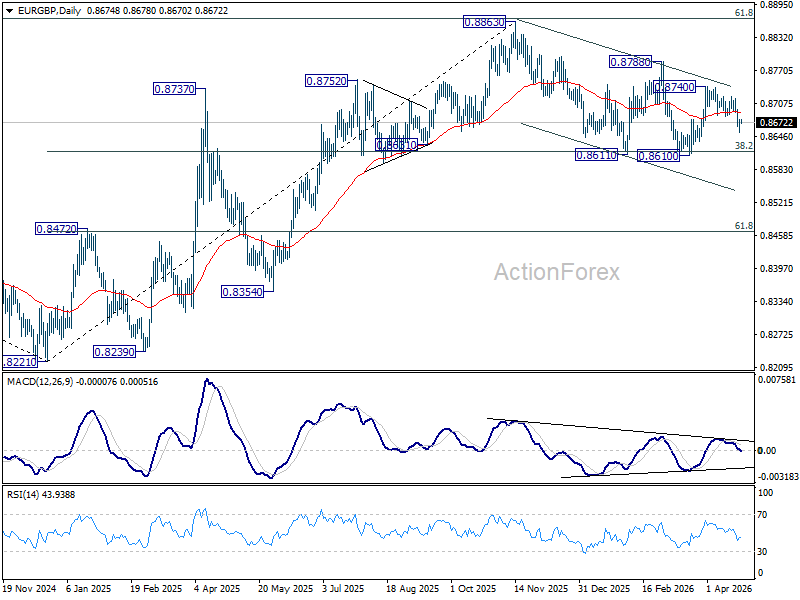 In the bigger picture, strong support was seen again from 38.2% retracement of 0.8821 to 0.8863 at 0.8618. Break of 0.8788 resistance will argue that larger rise from 0.8221 might be ready to resume through 0.8863 (2025 high). Nevertheless, sustained trading below 0.8618 should confirm bearish reversal, and bring deeper fall to 61.8% retracement at 0.8466 at least.