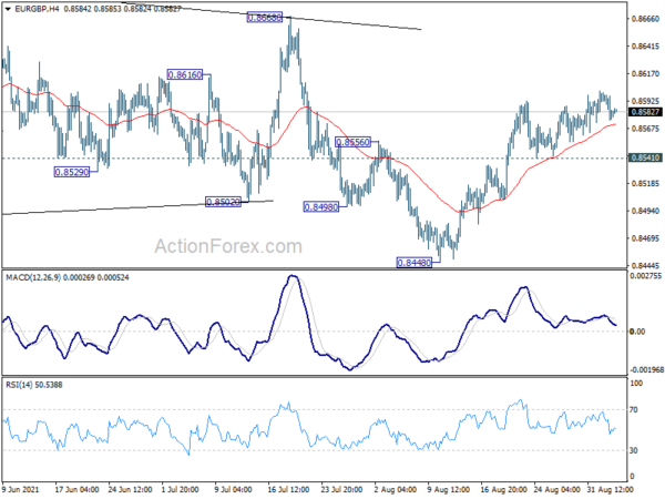 EUR/GBP is staying in consolidation form 0.8601 temporary top and intraday bias remains neutral. Another rise is in favor with 0.8541 minor support intact. On the upside, above 0.8601 will resume the rebound from 0.8558 to 0.8668 resistance. Firm break there will be a strong sign of near term bullish reversal at least. On the downside, however, break of 0.8541 support will turn bias back to the downside for retesting 0.8448 low instead.