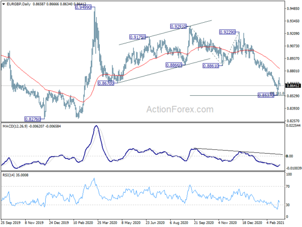 EUR/GBP stayed in range of 0.8537/8729 last week and outlook is unchanged. Initial bias remains neutral this week first. On the upside, break of 0.8279 will resume the rebound from 0.8537 and target 55 day EMA (now at 0.8798). However, firm break of 0.8537 will resume the decline towards 0.8276 key support.