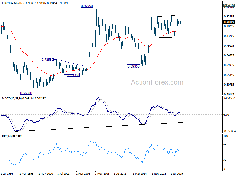Intraday bias in EUR/GBP remains neutral for the moment. With 0.9004 resistance intact, further decline is expected. On the downside, sustained break of 0.8866 key support will indicate that rebound from 0.8670 has completed at 0.9291. Deeper fall should be seen to 0.8670, to extend the pattern from 0.9499. On the upside, however, firm break of 0.9004 resistance will turn bias back to the upside for 0.9291 resistance.