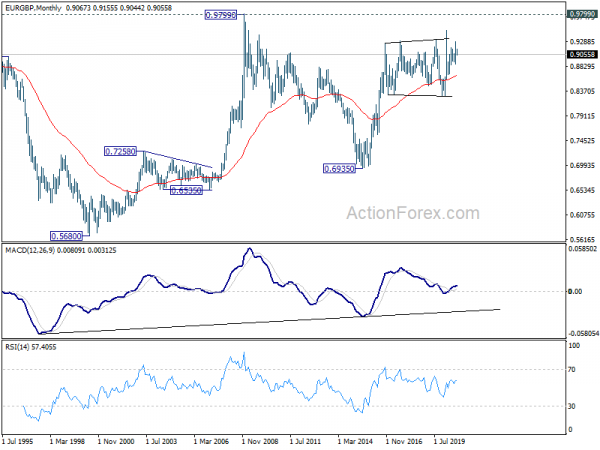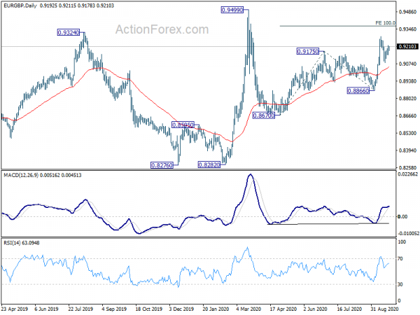 Intraday bias in EUR/GBP remains neutral and further fall is in favor with 0.9220 resistance intact. On the downside, break of 0.9024 will resume the decline from 0.9291 to 0.8866 support. Decisive break there should confirm completion of the whole choppy rebound from 0.8670. Though, break of 0.9220 will likely resume such rebound through 0.9291.