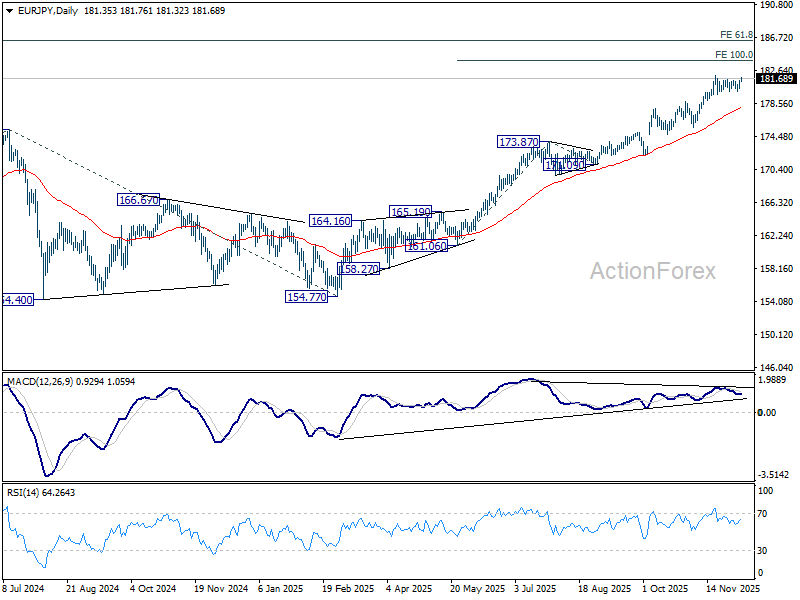 Intraday bias in EUR/JPY remains neutral for consolidations below 183.14. Further rally remains in favor as long as 180.07 support holds. But considering bearish divergence condition in both 4H and D MACD, upside should be limited 100% projection of 161.06 to 173.87 from 171.09 at 183.90, at least on first attempt. Meanwhile, firm break of 180.07 will confirm short term topping, and bring deeper correction to 55 D EMA (now at 178.84).