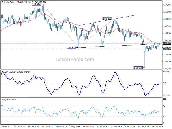 Intraday bias in EUR/JPY remains neutral at this point. On the downside, break of 123.78 support will suggest completion of rebound from 118.62 after rejection by 55 day EMA. Deeper fall would then be seen back to retest 118.62 low. However, decisive break of 125.95 will dampen our bearish view and target 129.25 resistance next.