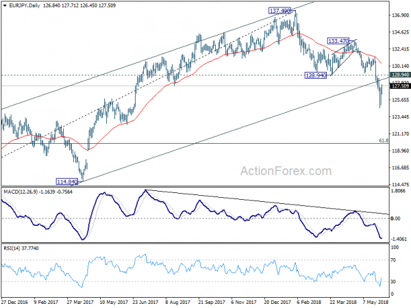 In the bigger picture, despite rebounding strongly ahead of 124.08 resistance turned support, there was no clear follow through buying. Note again that there is bearish divergence in daily MACD. Firm break of 124.08 will confirm trend reversal. That is, whole rise from 109.03 (2016 low) has completed at 137.49 already. In that case, deeper fall should be seen back to 61.8% retracement of 109.03 to 137.49 at 119.90 and below. Nonetheless, decisive break of 133.47 key resistance will likely extend the rise from 109.03 through 137.49 high.