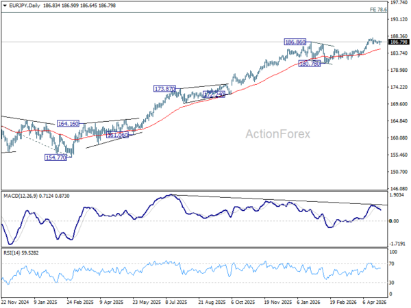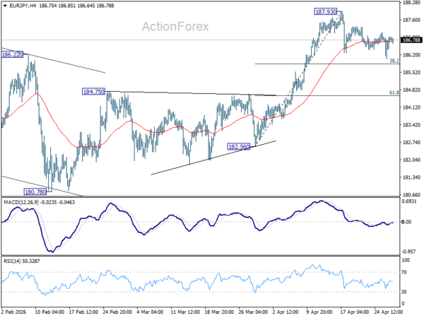 No change in EUR/JPY's outlook as consolidation from 187.93 is extending. Intraday bias stays neutral. Strong support is expected from 38.2% retracement of 182.56 to 187.93 at 185.87 to bring rebound. On the upside, firm break of 187.93 will resume larger up trend. However, further break of 185.87 will bring deeper fall to 184.75 resistance turned support instead.
