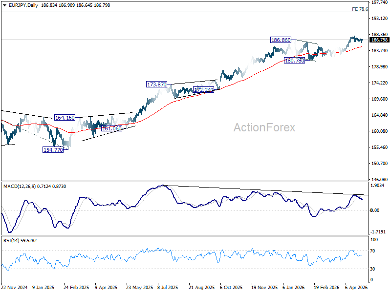 In the bigger picture, up trend from 114.42 (2020 low) is in progress. Next target is 78.6% projection of 124.37 (2022 low) to 175.41 (2025 high) from 154.77 at 194.88 next. For now, medium term outlook will stay bullish as long as 180.78 support holds, even in case of deeper pullback.