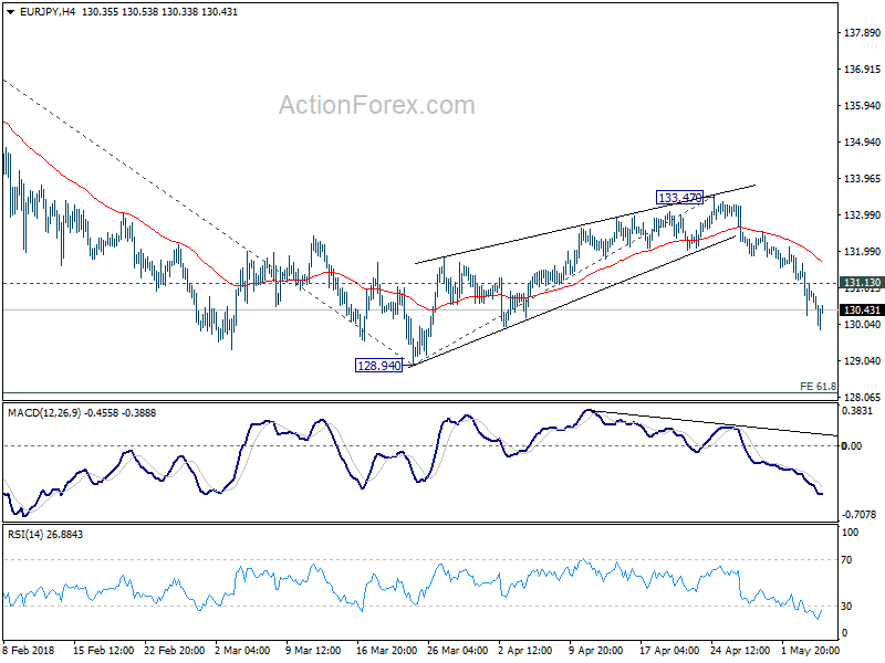 Intraday bias in EUR/JPY remain son the downside for 128.94 support. Break will resume whole decline from 137.49 and target 61.8% projection of 137.49 to 128.94 from 133.47 at 128.18 next. On the upside, above 131.13 minor resistance will turn bias neutral and bring recovery. But upside should be limited well below 133.47 resistance to bring another decline.