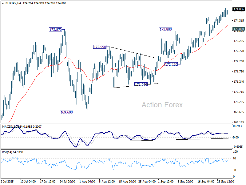 Intraday bias in EUR/JPY remains on the upside for retesting 175.41 high. Decisive break there will resume larger up trend. On the downside, however, firm break of 173.88 resistance turned support will turn bias back to the downside for deeper pullback to 172.11 support instead.