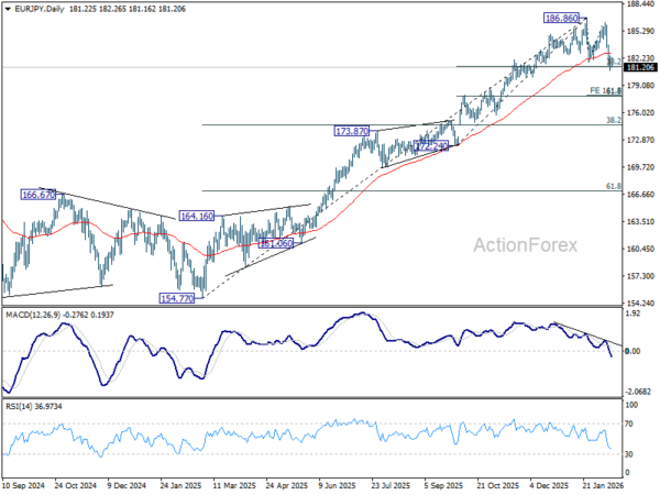 Immediate focus stays on 38.2% retracement of 172.24 to 186.86 at 181.27 in EUR/JPY. Decisive break there will argue that fall from 186.86 is correcting whole up trend from 154.77. Next near term target will be 161.8% projection of 186.86 to 181.76 from 186.22 at 177.96. Nevertheless, strong rebound from current level, followed by break of 182.99 minor resistance will retain near term bullishness, and bring retest of 186.86 high first.