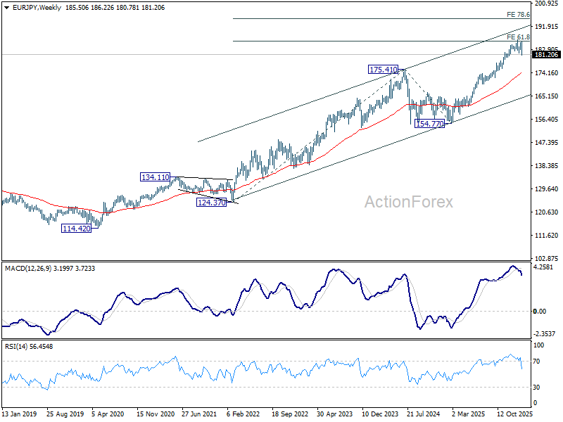 In the bigger picture, considering bearish divergence condition in D MACD and break of 55 D EMA (now at 182.67), a medium term top could be formed at 186.86 already. Deeper correction would be seen but downside should be contained by 38.2% retracement of 154.77 to 186.86 at 174.60 to bring rebound. Meanwhile, firm break of 186.86 will resume larger up trend to 78.6% projection of 124.37 to 175.41 from 154.77 at 194.88 next.