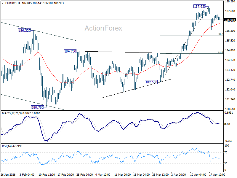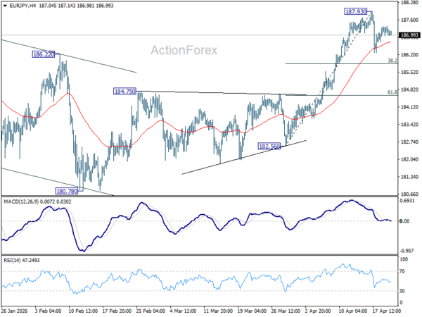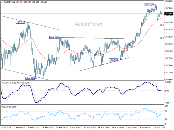 Intraday bias in EUR/JPY remains neutral and more consolidations could be seen below 187.93 short term top. Another fall might be seen to 38.2% retracement of 182.56 to 187.93 at 185.87. On the upside, though, break of 187.93 will resume larger up trend.