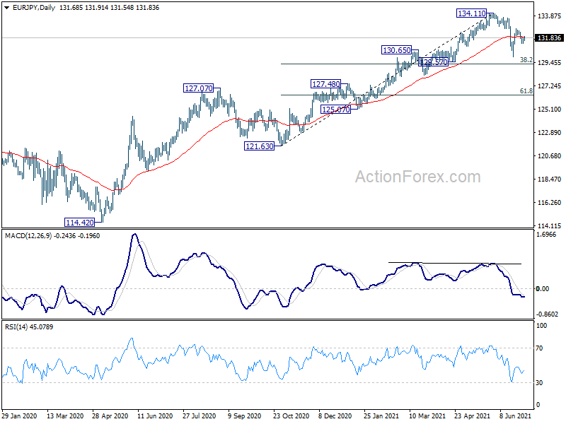 Intraday bias in EUR/JPY remains neutral first and more consolidative trading could be seen. But further decline is expected as long as 131.07 resistance holds. Break of 128.58 will resume the fall from 134.11. Such decline is seen as correcting whole up trend from 114.42. Deeper fall would be seen to 127.07 resistance turned support next.